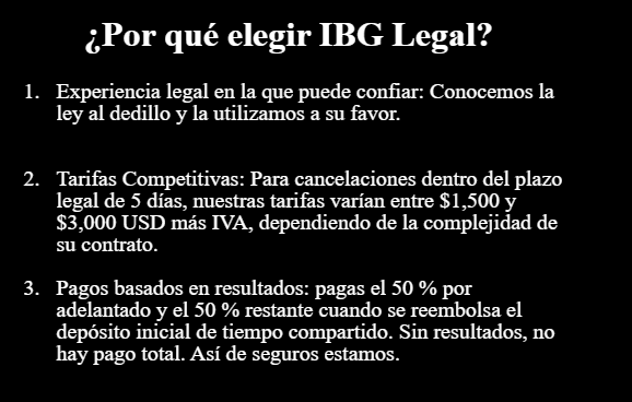 IBG Legal es una firma de abogados mexicana ubicada en Quintana Roo. Aunque su sitio web sugiere un enfoque en asuntos inmobiliarios—como adquisición de propiedades, fideicomisos y licencias—también ofrecen servicios de cancelación de tiempo compartido, denominados "terminación de contrato de tiempo...