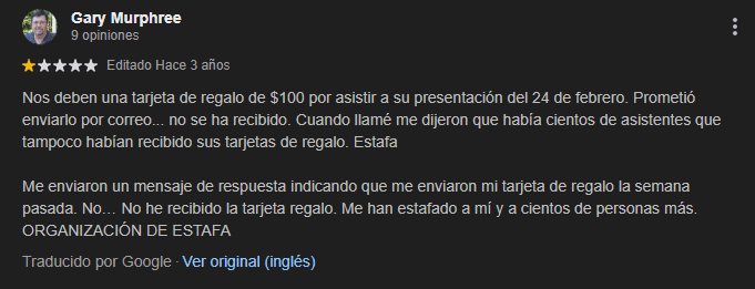 En aquel entonces, la página de Google de la compañía mostraba muchas más reseñas, varias de ellas evidentemente fabricadas con cinco estrellas. Hoy en día, esas reseñas han desaparecido por completo.