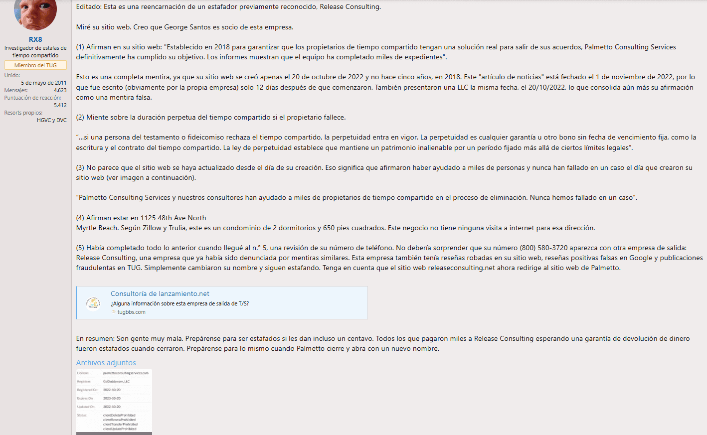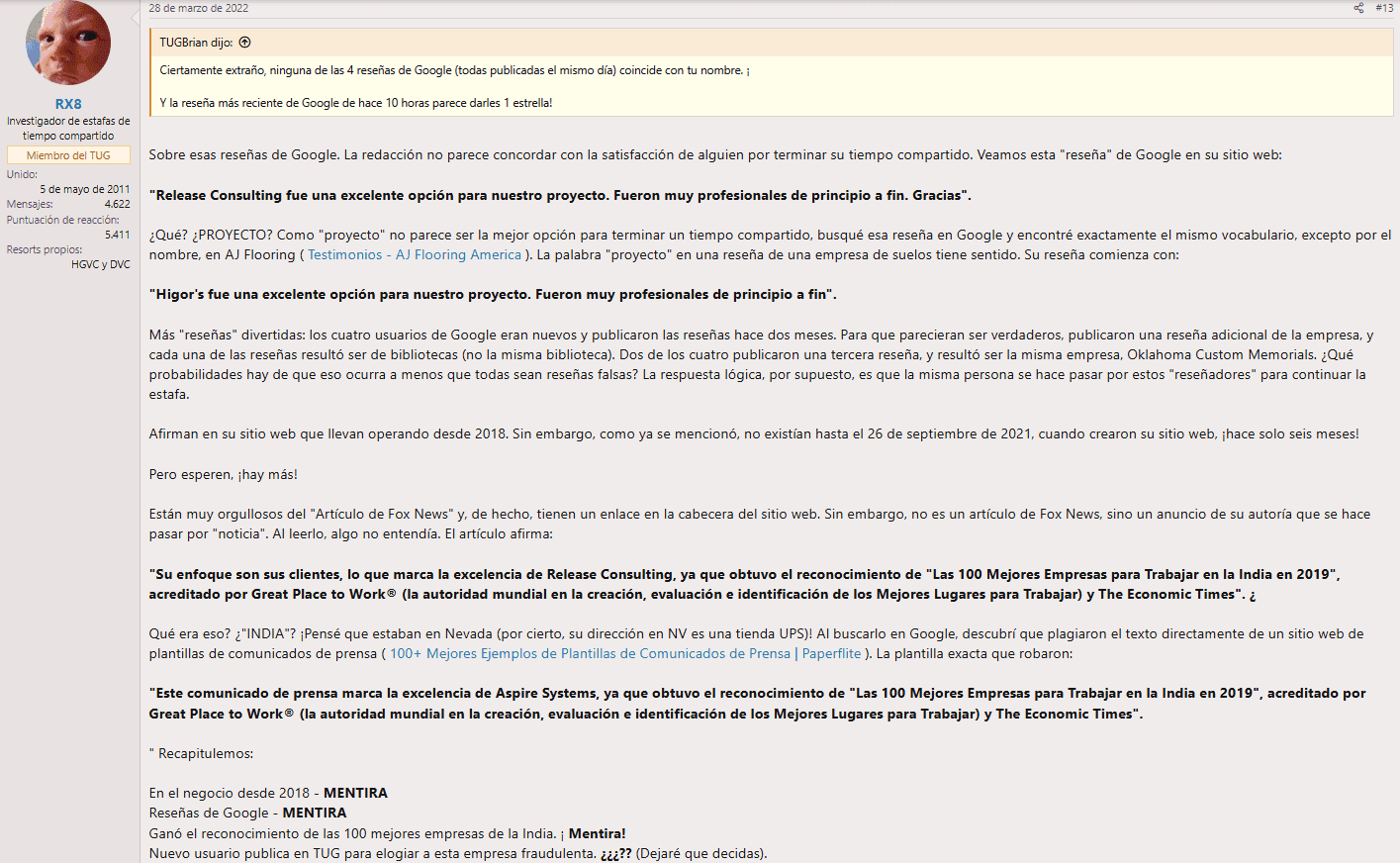 En foros como TUG (Timeshare Users Group), Release Consulting fue señalado repetidamente como otra estafa más. Un hilo en particular resulta revelador: mientras varios usuarios advertían sobre los peligros de las falsas firmas de salida, apareció un sospechoso comentario entusiasta—una pieza de autopromoción casi con certeza escrita por la misma empresa usando una cuenta desechable.