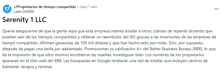 Según algunas quejas y reseñas dispersas, Serenity 1 LLC es conocida por llamar “de repente” a propietarios de tiempo compartido, supuestamente habiéndose hecho con sus datos de contacto de quién sabe dónde. Peor aún, hay informes que indican que Serenity 1 pide pagos por adelantado para iniciar una cancelación, algo que nunca debería aceptarse de una empresa legítima.