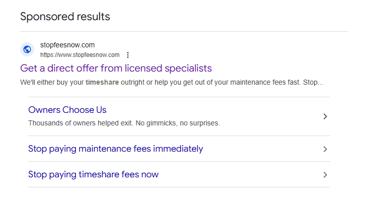 Si un sitio web de estafa de tiempos compartidos pudiera ser aún más obvio, este sería el ejemplo perfecto. Piensa en el clásico esquema de “pump-and-dump”: un sitio recién creado que mágicamente aparece en los primeros lugares de Google, claramente diseñado para atraer a cualquiera que busque una salida rápida a su tiempo compartido. “StopFeesNow”, sí, ese es el nombre, es el sitio más reciente y sospechoso que aparece en búsquedas relacionadas con la cancelación de tiempos compartidos.