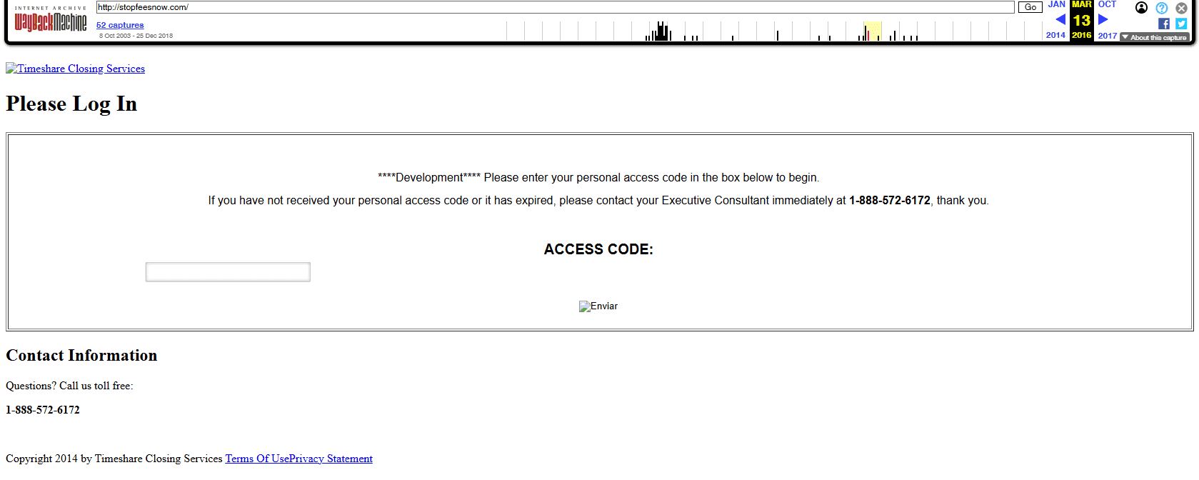 - Reapareció en 2015 como un sitio “en desarrollo” vinculado a una empresa llamada Timeshare Closing Services (TCS).
