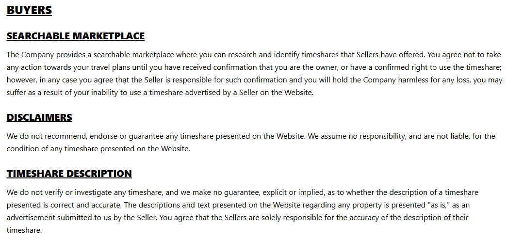 Afirman comprar tiempos compartidos a los usuarios para “detener las cuotas” y luego “anunciarlos” como un servicio de alquiler o reventa. Pero su sitio no tiene ningún mercado, ni listados, ni evidencia de ninguna propiedad siendo revendida.