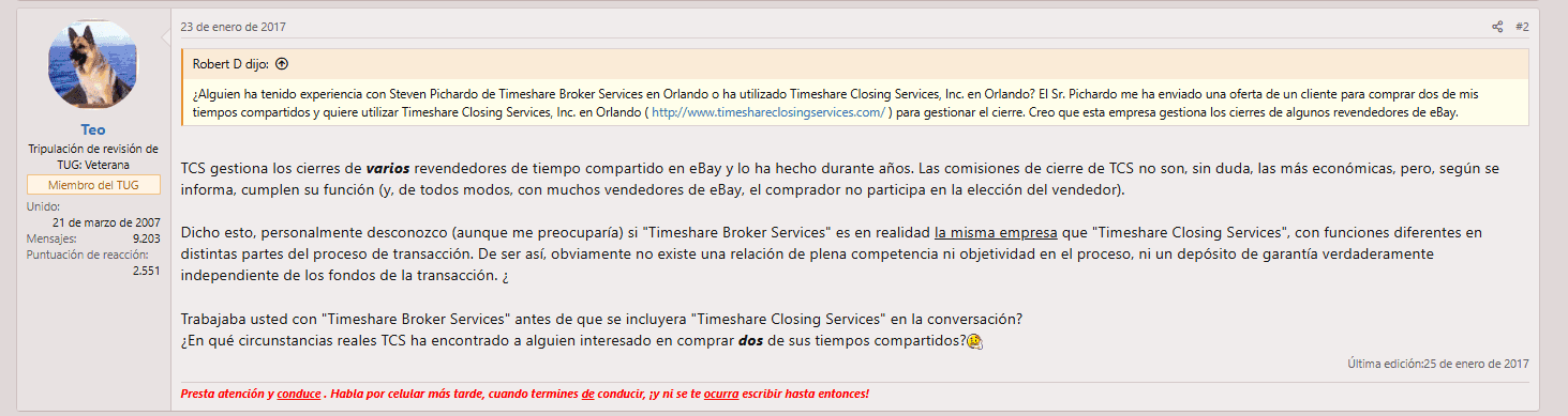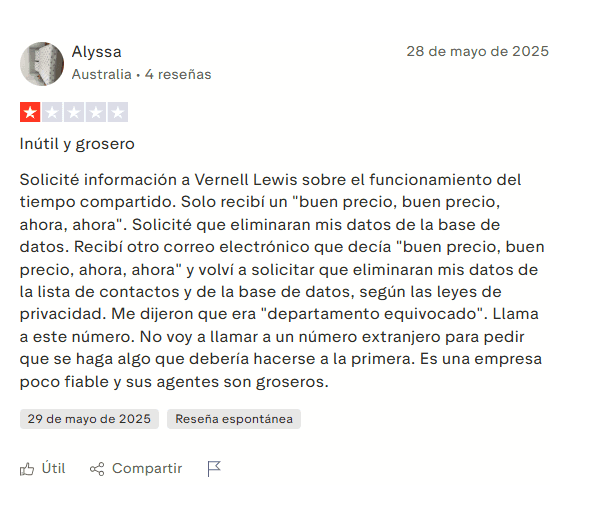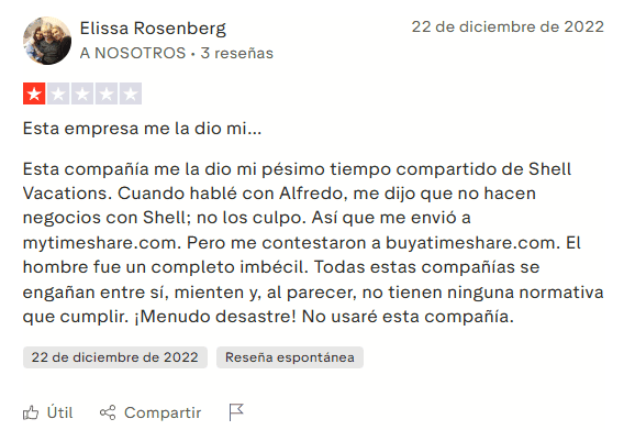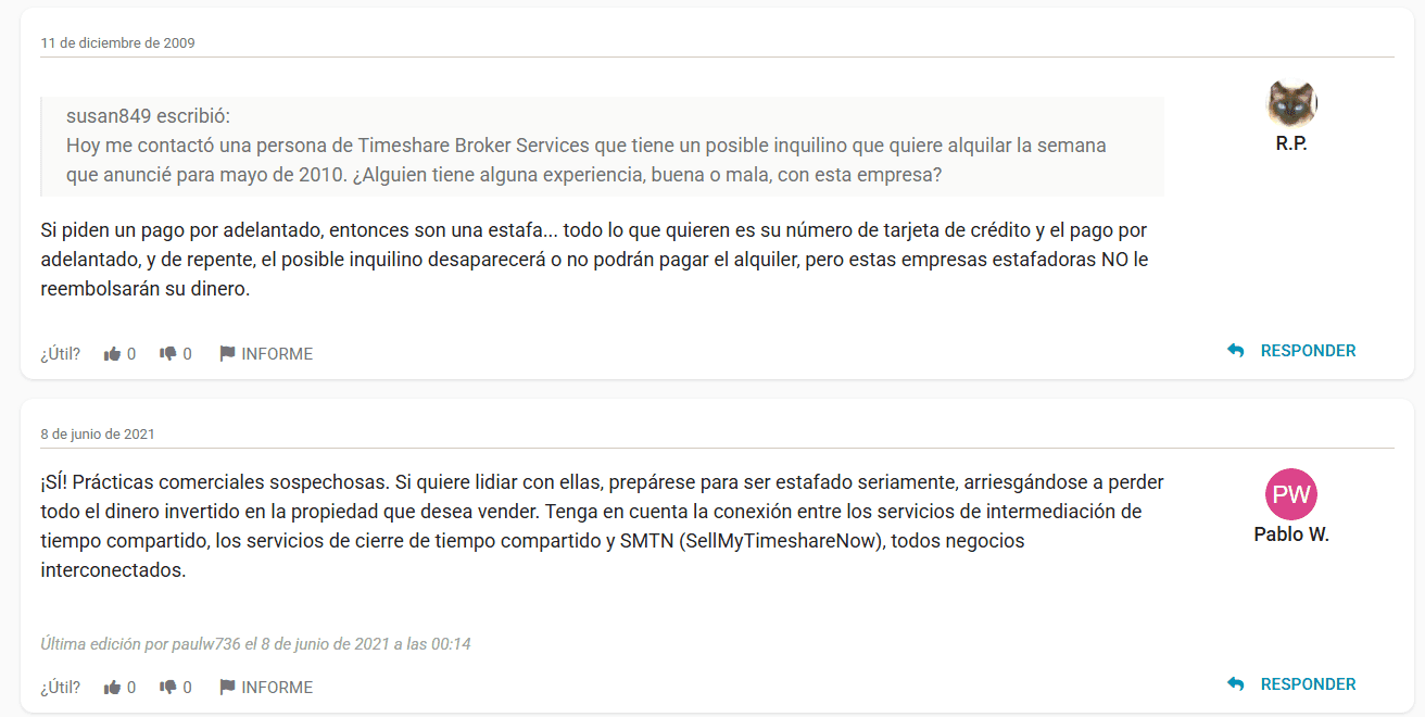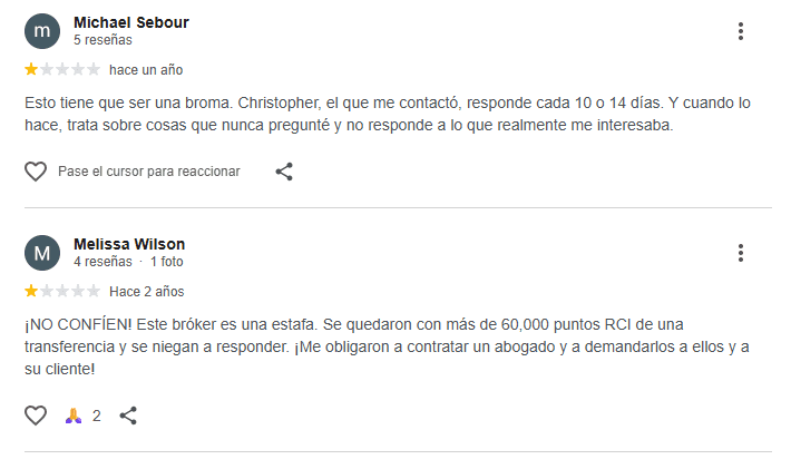 Fuera de su sitio web, sí es posible encontrar algunas menciones adicionales de Timeshare Broker Services. Hay reseñas en Google, algunas en Yelp y comentarios en foros como TUG (Timeshare Users Group). Esto demuestra cierta presencia externa, aunque el tono general de las opiniones es, en el mejor de los casos, mixto.
