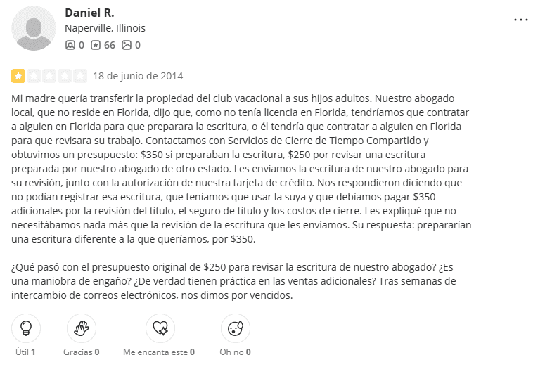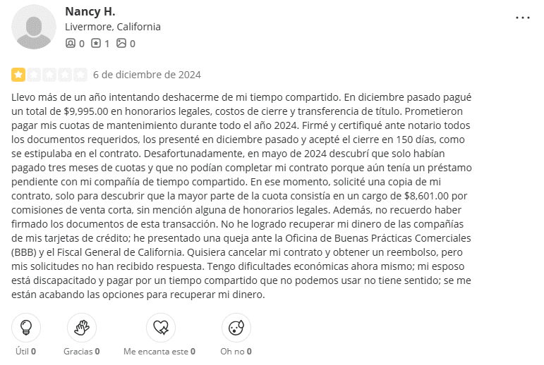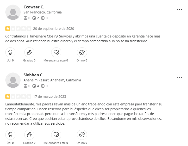 Con base en las quejas de usuarios, los registros públicos y los patrones de reseñas, no consideramos que Timeshare Closing Services sea una opción confiable. Sus prácticas, combinadas con los riesgos propios de las transferencias de tiempos compartidos, colocan a los consumidores en una posición vulnerable y con escasas opciones si algo sale mal.
