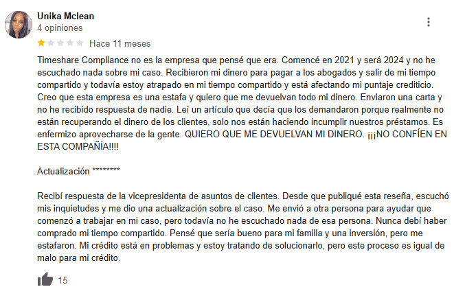 Un análisis más profundo de las reseñas de los clientes revela problemas más preocupantes. En Facebook, las reseñas recientes desde 2023 en adelante consisten principalmente en quejas sobre la falta de comunicación de la empresa con los clientes. Las reseñas en Google muestran una calificación de 3.9, pero los comentarios más recientes acusan a Timeshare Compliance de abandonar a los clientes y quedarse con su dinero. Acusaciones similares de mala conducta se reflejan en Trustpilot, donde la empresa tiene una calificación promedio de 3.1 basada en 437 reseñas.