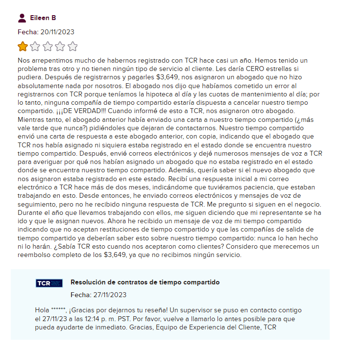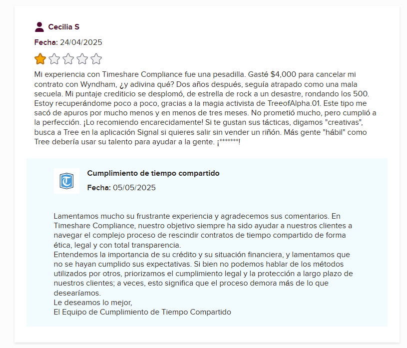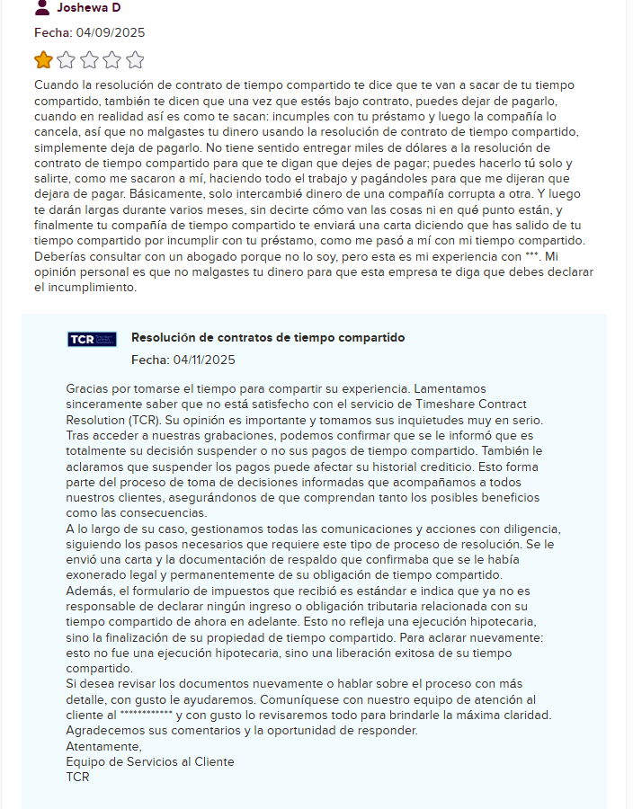 Y aquí viene lo mejor: uno de los propios reseñadores de cinco estrellas de TCR declaró abiertamente, “Antes se llamaban Timeshare Compliance.” ¿Y la respuesta oficial de TCR? “Queremos aclarar que Timeshare Contract Resolution es una empresa separada y distinta, y no está afiliada con Timeshare Compliance.” ¿Ah sí? ¿Seguro de eso?