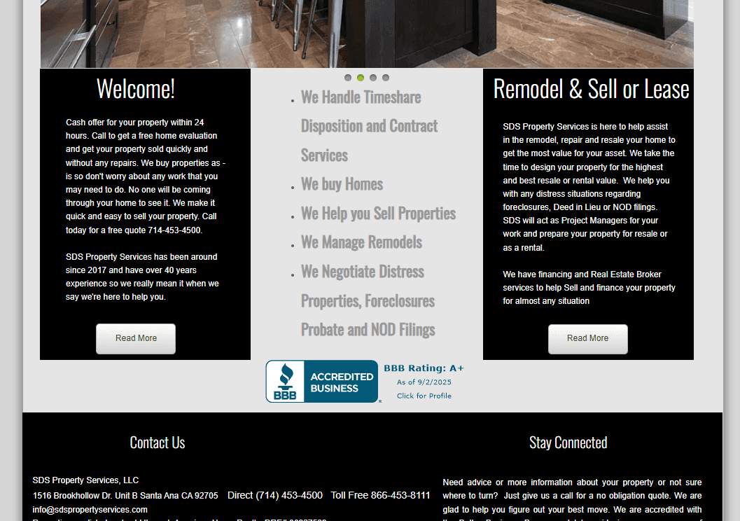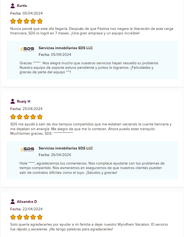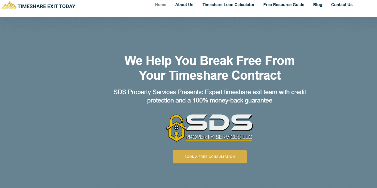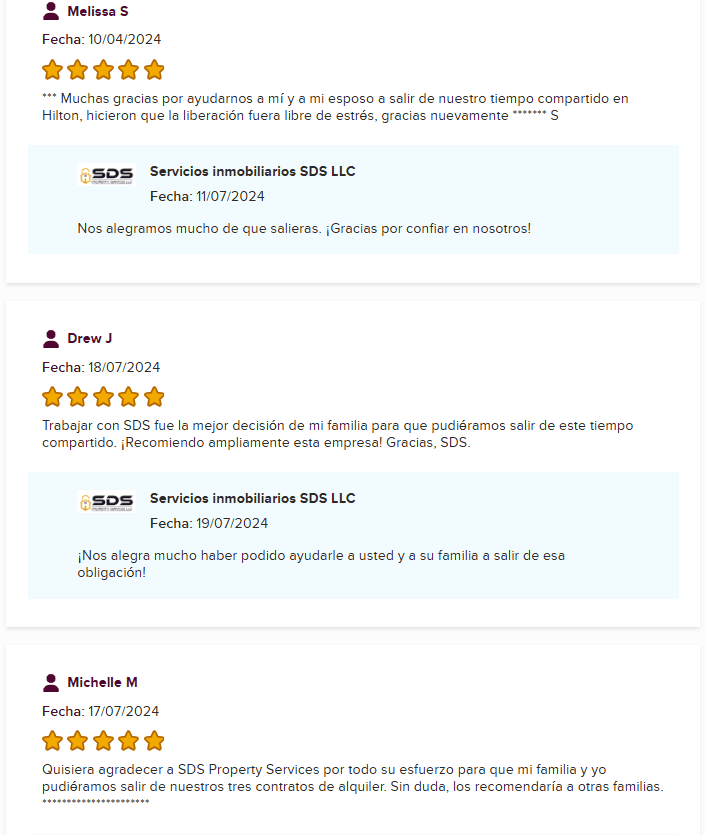 En su favor, el sitio principal de SDS Property Services (sdspropertyservices.com) es más claro. Hace referencia directa a sus servicios de cancelación de tiempos compartidos, aunque la mayor parte del sitio se centra en remodelaciones inmobiliarias y ventas.