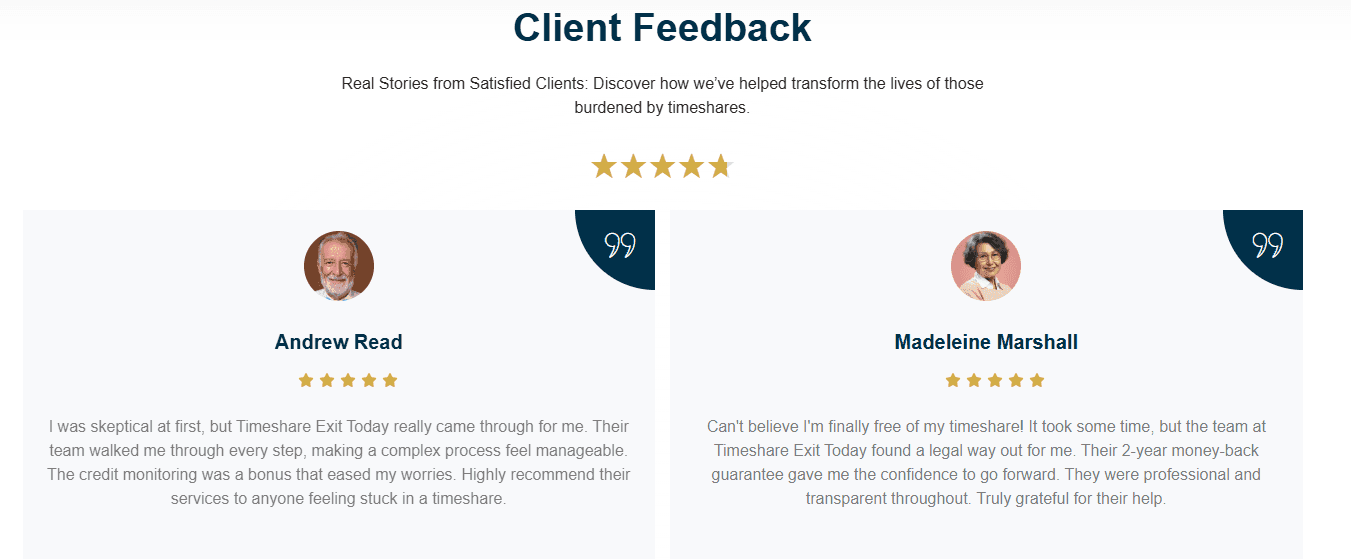Veredicto: Timeshare Exit Today, a través de su asociación con SDS Property Services, no da la impresión de ser malicioso o abiertamente fraudulento. Sin embargo, la falta de transparencia, la limitada presencia en línea, los testimonios dudosos y la mínima actividad hacen difícil confiar plenamente en ellos. Sus reseñas en BBB, aunque brillantes, parecen demasiado buenas para ser verdad sin una gama más amplia de retroalimentación de clientes.