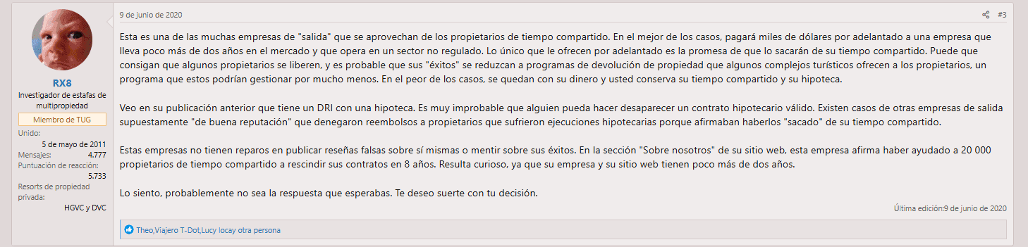 En cuanto a su sitio web, no hay nada particularmente distintivo. El mensaje sigue un patrón muy común: afirmaciones sobre experiencia, referencias a una supuesta “trayectoria” y promesas generales de ayudar a los clientes a salir de sus contratos de tiempo compartido. Es el tipo de discurso que hemos visto repetirse en muchas empresas similares, sin aportar demasiados elementos que lo respalden.