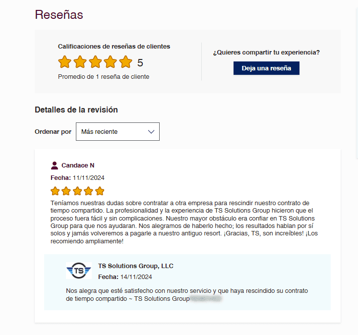 Nuestro veredicto: Aunque no está rodeada de controversias evidentes, la falta de información verificable, junto con señales de posible eliminación de reseñas y una presencia empresarial cuestionable, hacen que TS Solutions Group sea difícil de recomendar. Si estás buscando ayuda para cancelar un tiempo compartido, te sugerimos considerar opciones más establecidas y mejor documentadas.