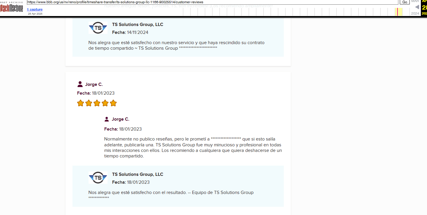 Para empezar, TS Solutions Group se presenta como una empresa de cancelación de tiempo compartido. Eso está claro. Lo que no está claro es prácticamente todo lo demás. A pesar de que existen indicios de que han estado operando desde aproximadamente 2018–2019, hay muy poca información verificable sobre sus operaciones, historial o trayectoria real.